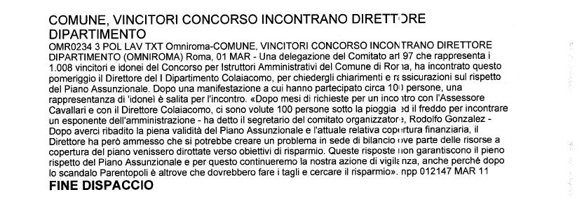 Il Comitato art.97 che rappresenta i 1008 vincitori ed idonei del Concorso per Istruttori Amministrativi del Comune di Roma, a latere della manifestazione organizzata per le 15,30 del 1 Marzo davanti all’Assessorato al Personale, è riuscito ad incontrare il Direttore del I Dipartimento Colaiacomo, con l’intento di chiedergli chiarimenti e rassicurazioni sul rispetto del Piano Assunzionale. “Dopo mesi di richieste per un incontro con l’Assessore Cavallari e con il Direttore Colaiacomo, ci sono volute 100 persone sotto la pioggia ed il freddo per incontrare un esponente dell’Amministrazione” – ha dichiarato il segretario del comitato organizzatore, Rodolfo Gonzalez. “Nonostante la riottosità delle istituzioni e le intemperie affrontate, siamo però riusciti ad avere solo delle blande rassicurazioni sulle nostre assunzioni” – ha proseguito Gonzalez . “Dopo averci ribadito la piena validità del Piano Assunzionale e l’attuale relativa copertura finanziaria, il Direttore ha però ammesso che si potrebbe creare un problema in sede di bilancio ove parte delle risorse a copertura del piano venissero dirottate verso obiettivi di risparmio” – ha aggiunto il segretario. “Queste risposte” – ha concluso Gonzalez – “non garantiscono il pieno rispetto del Piano Assunzionale e per questo continueremo la nostra azione di vigilanza, anche perché dopo lo scandalo Parentopoli è altrove che dovrebbero fare i tagli e cercare il risparmio”.